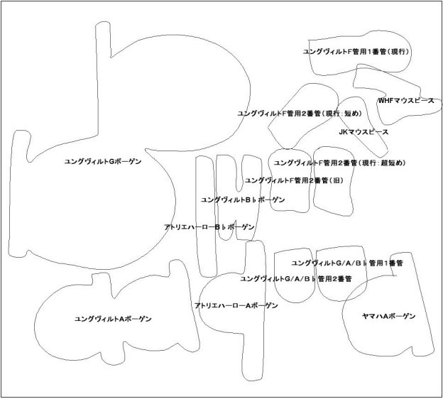 ウィンナホルンは「F管(=ヘ長調)」のシングルホルンであることが基本形ですが、マウスパイプにあたるボーゲン(クルーク)や、バルブ毎の管を付け替えることで、他の調性に切り替えることも可能です。(ボーゲンだけを付け替えた状態ですと、その調のナチュラルホルン状態での使用となります) 当会メンバーが所有する各種ボーゲンや替え管(+マウスピース少々)を集めてみましたので、ご覧になってみてください。 |