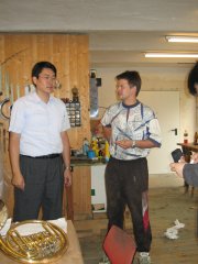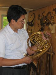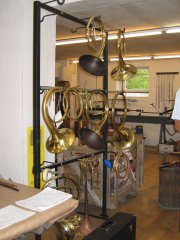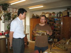 Jungwirth訪問記 文:中根 慎介/写真:阿曽 直樹 2004年6月15日 訪問者:阿曽・佐々木・中根 住所:Freishling21 聖地訪問前に予めユンク氏にメールし、訪問当日の朝Wienから電話したところ、非常に友好的に対応頂き、16時にアポをとってやっと実現したものです(2002年訪問時はユンク氏がインフルエンザでダウンして表敬訪問できませんでしたので)。 行き方など: フランツ・ヨーゼフ駅からKrems行き(急行)にのってHadersdorfでHorn行きに乗り換え、Plank am Kampで下車、南に500m程歩いたところのRathaus(町役場)前電話boxからTELし、そこまで2番弟子(高校生くらい)迎えに来てもらいました(車で5〜10分程度のところに工房あり)。フランツ・ヨーゼフからPlank am Kampまで乗車時間は片道約1時間30分でHardersdorfまで9ユーロ、そこからナンボか忘れましたが急行料金は取られませんでした。めしを食うところがPlank am Kamp駅前にないので要注意(ハイチュウ2個でしのいだ)。 予定より早く到着したためユンク氏は不在。代わりに1番弟子が案内してくれました(この1番弟子はヴィーンから毎日1時間かけて車で通勤している。ちょうどトムベック氏対応に役立っているようです)。 1.ヴィーナーホルンニューモデル(デーマル) 新しい点はベルの板厚さが若干薄い(以前0.45mmでしたが、最近は0.42、0.40と薄型でも作成)ことと、バランスを考慮してチューニングスライドのポジションが上(バネ側)にくるようチューニングスライドに直結する管の巻き方を変えたことなど。 ユンク氏は相当自信を持っているようす。値上げしないでねー。 製作した1本目は試奏した人が気に入って「これは俺のもんだ」とかなんとか言って持っていってしまったとか。2本目はトムベックさんがヴィーンでテスト中(翌日アイネムホールでのグランパルティータのリハーサルでトムベック氏が使用されているのを拝聴。聴いた感じはグッドレスポンスだがやや軽めのよう)。 トムベックさんの天才ぶりをユンク氏は語っていました。ちょっとした楽器の違いをちょっと吹くだけで即座に見事に言い当ててしまうらしい。相当神経も使うが彼のおかげですごく進歩できて感謝しているそうな。 太鼓バネは最近のユンク機種には装着されていません。ユンク氏が来る前に1番弟子はギザギザのついた太鼓ばねが最新のバネだと説明してくれましたが、実際には初期のモデルにこのギザギザ太鼓バネが装着されていました。太鼓バネのコストは外バネの2倍以上(外注のため)で以前ユンク氏から聞いたところでは彼の友人が作成していたがリタイアしてしまったため、もう外バネしか作れないはずです。 現在のJungwirth製の3番管抜き差し部は平行となっているのが特徴ですが、他社同様の形状をしたそれも作成してあって、なぜそんなんつくったのか理由を聞きましたが、従来の平行の方が抜けがいいと言わはるばかりで、はっきりとしたことは不明でした。 2.初期(?)ヴィーナーホルン作成 むかしヴィーナーホルンが進化する課程で右の写真のような形をした楽器があったらしいのですが、これはドイツ人のあるホルン奏者が作成をユンク氏にオーダーしたため複製したのこと。隣の部屋の壁にその元となる古い楽器がありました。山西先生の記事でみたような形。試奏しましたが、音質が軽くてふわふわしてツボも私のもと全然ちがって吹きにくい。オーダーした人は何かいいところがあるに違いないと思ったのか、他人と違う楽器を所持したいと思ったかはわかりませんが、現在この形は生き残っていないということはそれなりの理由があるということですな。やはりヴィーンの奏者は全く興味を示さないらしい。 3.ナチュールホルン ユンクさんのHPにもあるとおりラウーモデル(クランツ付き)とライスマンモデル(クランツなし安価)があり、ライスマンモデルはフレアの中が黒。1番弟子が言うには板厚が薄いので磨きがかけられないとか。両者ともかなり重量が軽く、ユンク氏が言うには重量はもっとも重要で、各機種同一に調整しているときっぱりと言っておられました。私には自分のナチュールホルンと比べて軽すぎて吹きにくかった。慣れるとこちらの方が良いかもしれないですが、持ち方の工夫がないとストップ時に楽器が動きすぎてしまう。実音Gの音などがツボが狭く感じた。 4.ヤークトホルンの当時の製法再現 ほとんどがハンドメイドで機械による作業を少なくし、ユンク氏自ら初めて作成したものとか。ベルの曲げた部分には均等にしわのような模様が入っており、博物館のものと同じらしいです。調はDes(415HzのD)。 ヤークトホルンの場合、右手は外に出していたと通常思われていますが、博物館のオリジナルはベルの内側がすり減っており、手を内側に入れていた可能性もあるとか。 5.Hoch-F作成 14年程前に試作したがやめてしまった模様。最近のヴィーナーホルンはヤマハ、ハーグストン、ユンクヴィルトなど性能を上げてきており、Hoch-Fを必要としないので特に熱意を持って作成するほどのモノで